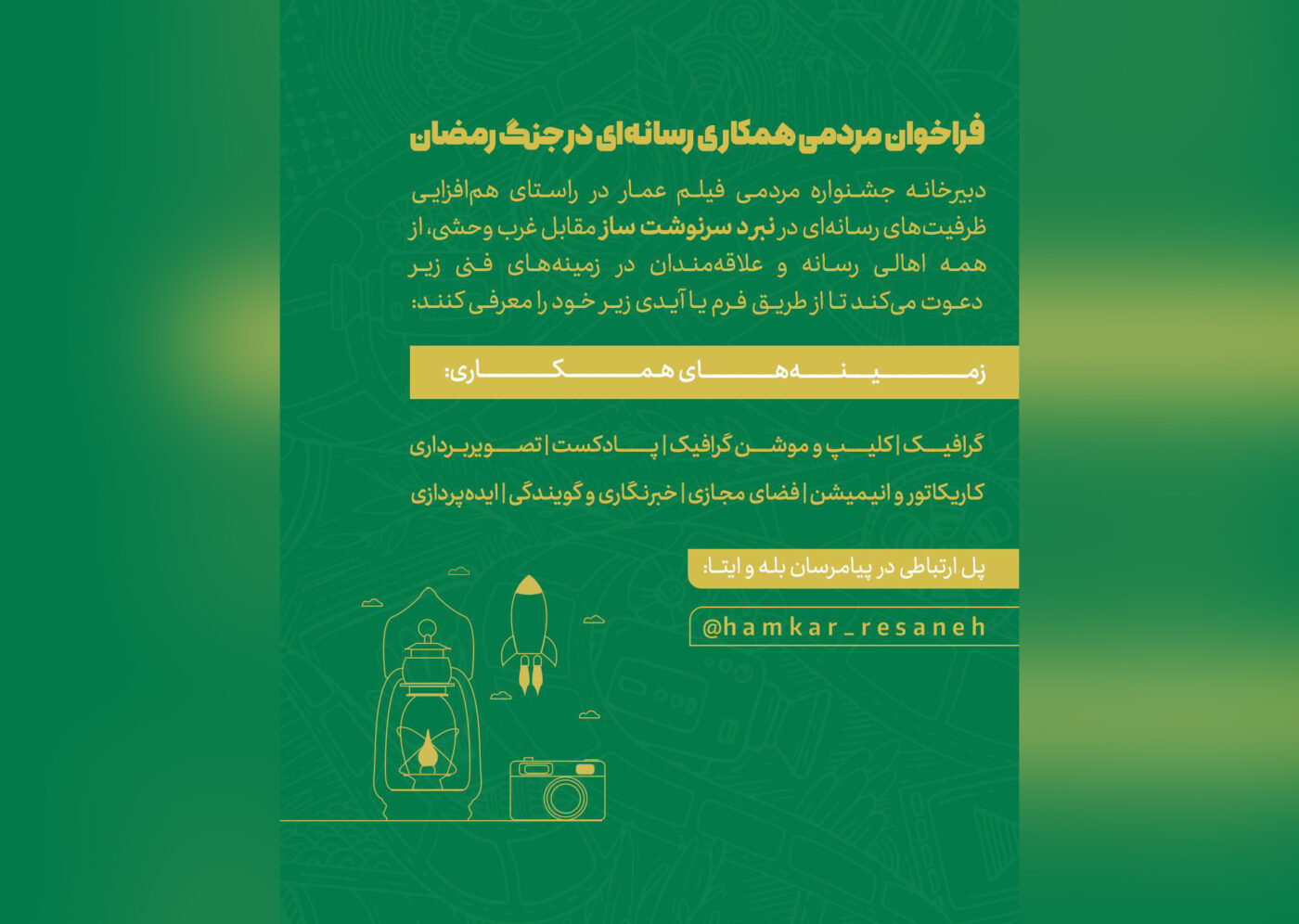 دبیرخانه جشنواره مردمی فیلم عمار در راستای همافزایی ظرفیتهای رسانهای در نبرد سرنوشت ساز مقابل غرب وحشی، از همه اهالی رسانه و علاقهمندان در زمینههای فنی زیر دعوت میکند تا خود را معرفی کنند.ادامه