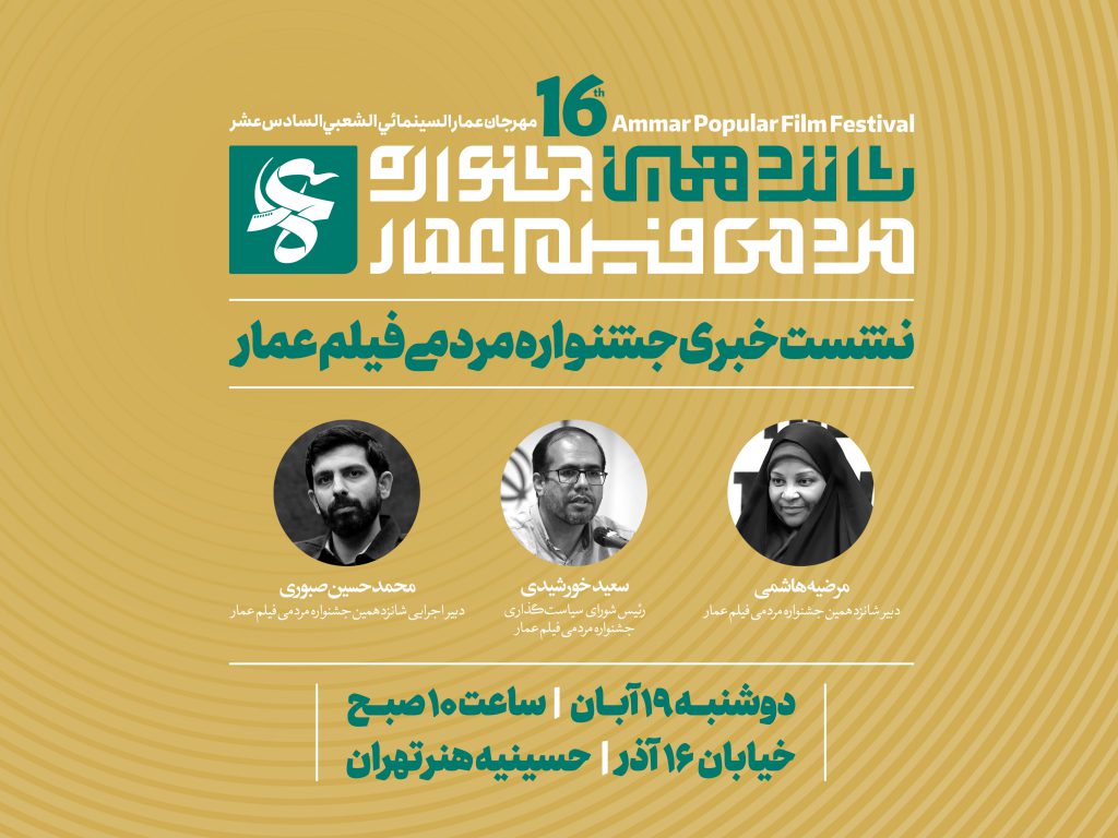 پس از اعلام فراخوان شانزدهمین جشنواره مردمی فیلم عمار، اولین نشست خبری این جشنواره، روز دوشنبه ١٩ آبانماه، ساعت ۱۰ در حسینیه هنر تهران برگزار خواهد شد.