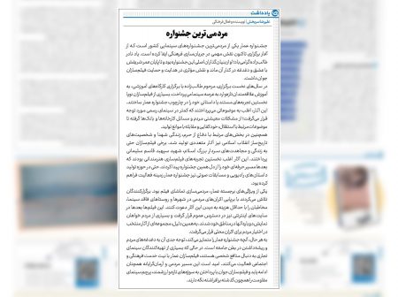 جشنواره عمار یکی از مردمیترین جشنوارههای سینمایی کشوراست که از آغاز برگزاری تاکنون نقش مهمی در جریانسازی فرهنگی ایفا کرده است.